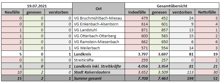 7.708 Indexfälle in Stadt und Landkreis, 7.463 genesenen Personen, 194 Todesfälle, 19.07.