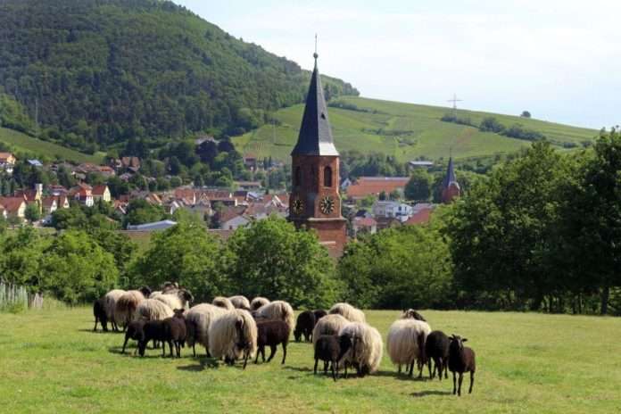 Bildunterschrift: Beweidung trägt zur Erhaltung der Artenvielfalt und der abwechslungsreichen Kulturlandschaft im Pfälzerwald bei und wird durch das „Hirtenwege“-Projekt gefördert, hier Schafe bei Albersweiler (Foto: Biosphärenreservat Norman Kraß/frei)