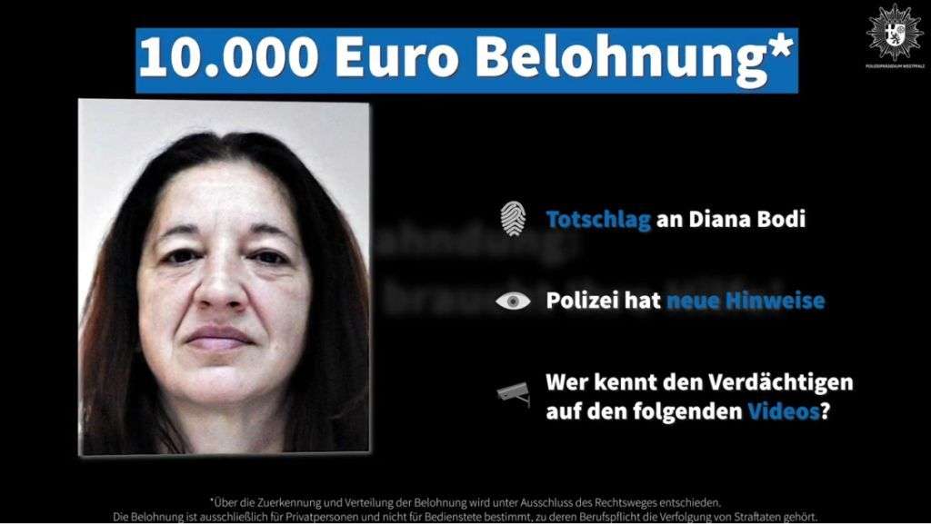 Nach dem Auffinden der Toten nahm eine Sonderkommission bei der Kriminaldirektion Kaiserslautern die Ermittlungen auf. Die Beamten sicherten Spuren, unter anderem die Aufzeichnung einer Überwachungskamera des Parkhauses in der Rosenstraße. Das Parkhaus Central befindet sich in der Nähe zum Fundort der Leiche. Bei der immer noch andauernden Auswertung des umfangreichen Videomaterials sind die Ermittler auf eine männliche Person aufmerksam geworden. Der Mann läuft mehrfach vor dem Parkhaus in der Rosenstraße auf und ab und zieht schließlich einen Einkaufswagen hinter sich her. Auf der unteren Ablage des Wagens transportiert er einen größeren, weißen Gegenstand. Bei diesem Gegenstand könnte es sich um die verpackte Leiche von Diana Bodi handeln.