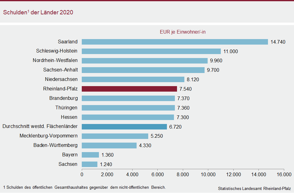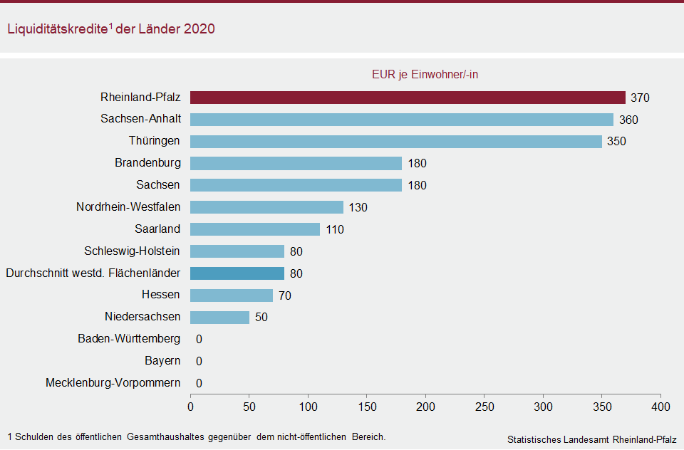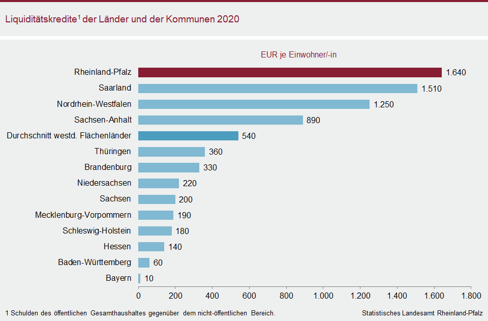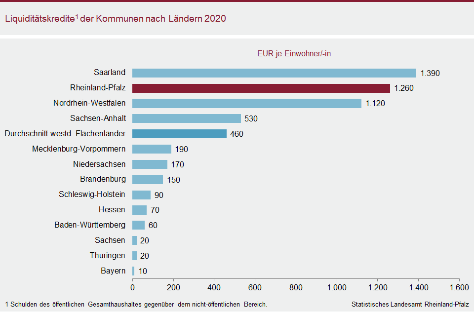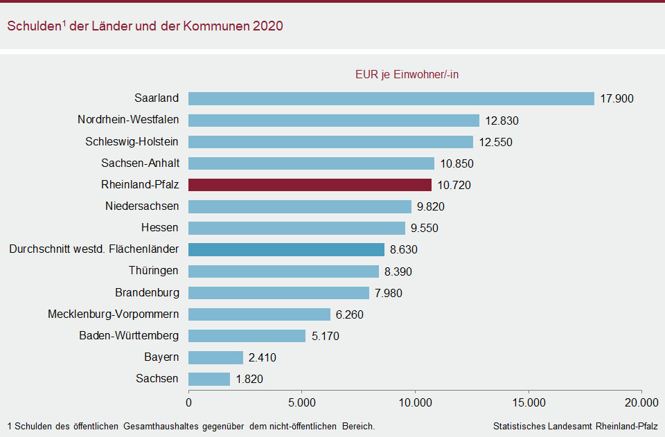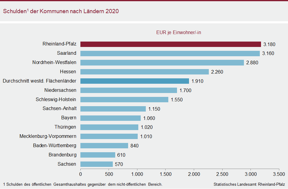 Im Vergleich der Bundesländer weist Rheinland-Pfalz 2020 eine überdurchschnittliche Verschuldung auf: Die Landesebene liegt 12 Prozent, die Kommunalebene 66 Prozent über dem Pro-Kopf-Durchschnitt der westdeutschen Flächenländer. Damit weisen die rheinland-pfälzischen Kommunen 2020 erstmals deutschlandweit den höchsten Wert aus. In anderen Bundesländern wurde die vormals sehr hohe kommunale Verschuldung in den vergangenen Jahren deutlich stärker reduziert als in Rheinland-Pfalz. Vielfach übernahm die Landesebene einen wesentlichen Teil der Schulden ihrer Kommunen – zum Teil wurden die Schulden auch nur in Einheiten außerhalb des Berichtskreises der amtlichen Schuldenstatistik überführt.