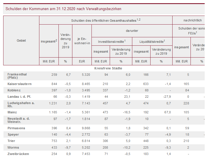 Die Daten stammen aus der jährlichen Schuldenstatistik. Die Schulden umfassen Liquiditätskredite (Kassenkredite), Investitionskredite und Wertpapierkredite der Kernhaushalte und der Extrahaushalte des Landes bzw. der kommunalen Gebietskörperschaften in Rheinland-Pfalz zum Stichtag 31. Dezember 2020. Als Schulden werden nur Schulden gegenüber dem nicht-öffentlichen Bereich, wie z. B. gegenüber Kreditinstituten und Banken ausgewiesen (in Analogie zum „Europäischen Stabilitäts- und Wachstumspakt“ sowie dem 2012 zusätzlich unterzeichneten „Europäischen Fiskalpakt“). Schulden innerhalb des öffentlichen Bereichs, wie z. B. zwischen einer Gemeinde und einer Verbandsgemeinde, bleiben demnach unberücksichtigt. Die Pro-Kopf-Verschuldung bezeichnet die rein rechnerische Verschuldung der jeweiligen Gebietskörperschaft in Relation zur Einwohnerzahl.