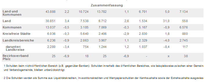 Für die Landkreisbereiche (Kreise inklusive der zugehörigen Verbands- und Ortsgemeinden) berechneten die Statistiker einen Schuldenrückgang um 0,9 Prozent. Die Schulden fielen auf 6,2 Milliarden Euro bzw. knapp 2.100 Euro je Einwohnerin bzw. Einwohner.