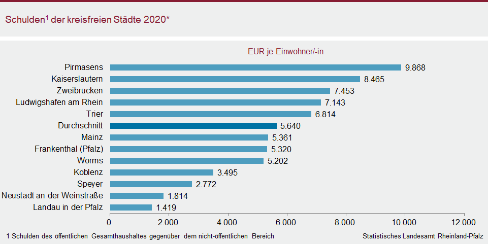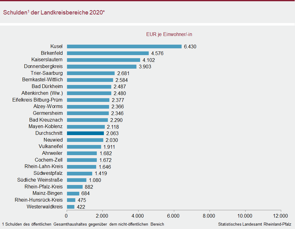 Die Regionen wiesen teilweise deutliche Unterschiede auf. Bei den kreisfreien Städten wurde für Landau in der Pfalz (1.420 Euro) die niedrigste, für Pirmasens (9.870 Euro) die höchste Pro-Kopf-Verschuldung ermittelt. Innerhalb der Landkreisbereiche verbuchte der Westerwaldkreis die geringsten Schulden (420 Euro). Die höchsten Schulden pro Kopf hatte der Landkreisbereich Kusel. Rechnerisch entfiel hier auf jede Einwohnerin bzw. jeden Einwohner eine Schuldenlast von 6.430 Euro, also fünfzehnmal so viel wie im Westerwaldkreis. Die Spannweite zwischen dem höchsten und dem niedrigsten Schuldenstand pro Kopf nahm 2020 weiter zu.
