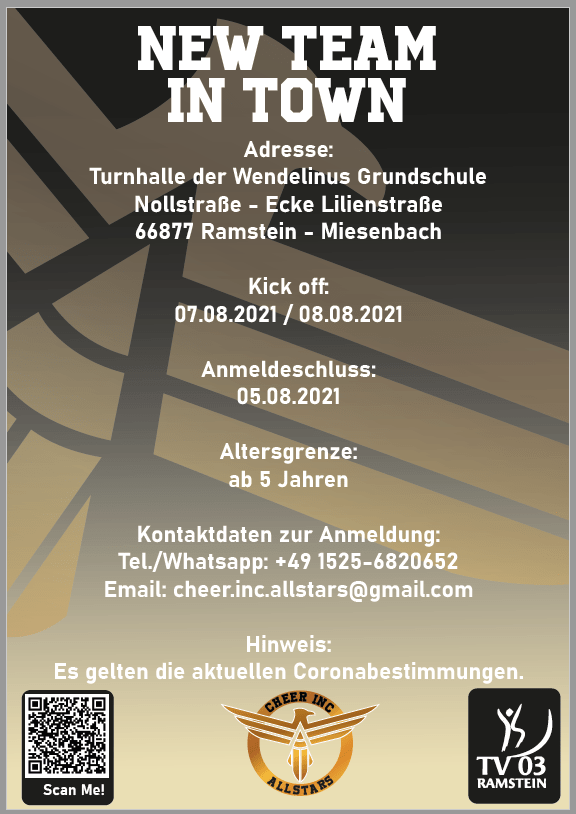 Wir sind das Team von Cheer Inc. Allstars, einem neuen Cheerleading Verein in Ramstein! Wir freuen uns, euch endlich zu unserem 1. Probetraining einladen zu können!