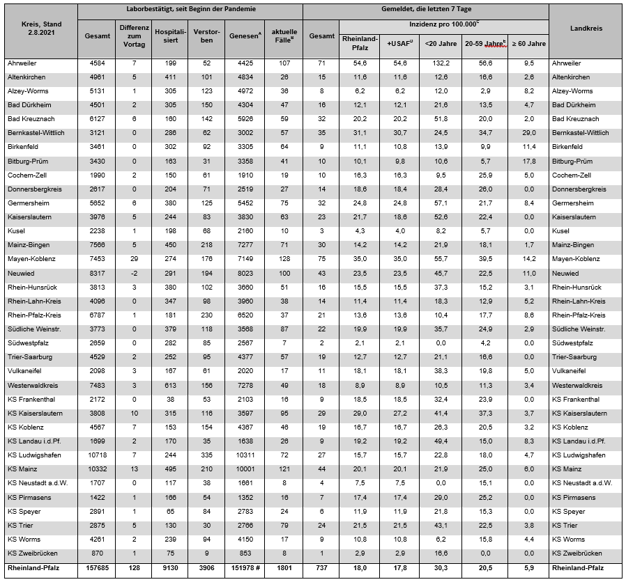 Coronavirus SARS-CoV-2: Aktuelle Fallzahlen für Rheinland-Pfalz, (Datenstand vom 02.08.2021, 14:10 Uhr)
