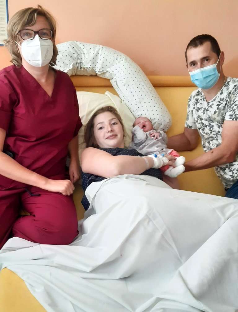Bildunterschrift: Die Stv. Leitende Hebamme, Ludivine Pagani (l.) beglückwünscht Petronela (M.) und Domitro Ihnatiuc (r.) zur Geburt ihrer Tochter Ana Maria.