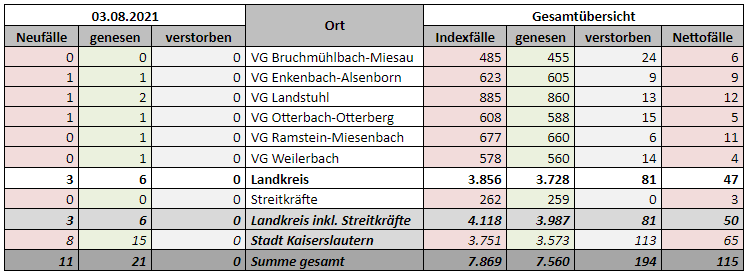 7.869 Indexfälle in Stadt und Landkreis, 7.560 genesenen Personen, 194 Todesfälle, 03.08.