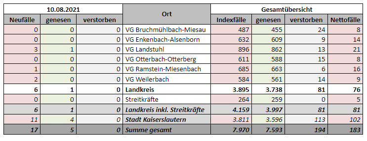 7.970 Indexfälle in Stadt und Landkreis, 7.593 genesenen Personen, 194 Todesfälle, 10.08.