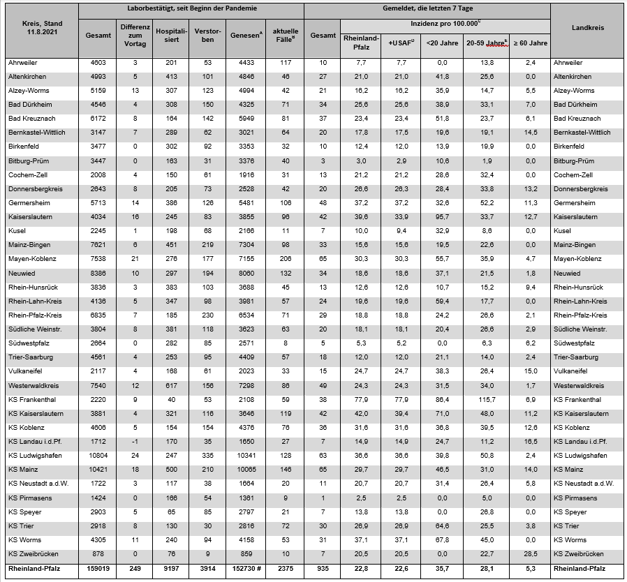 Coronavirus SARS-CoV-2: Aktuelle Fallzahlen für Rheinland-Pfalz, (Datenstand vom 11.08.2021, 14:10 Uhr)