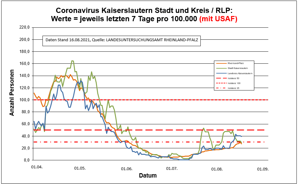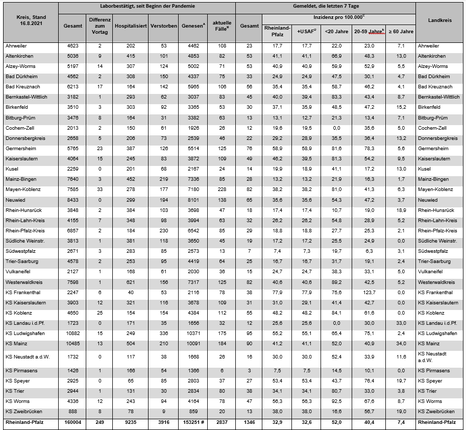 Coronavirus SARS-CoV-2: Aktuelle Fallzahlen für Rheinland-Pfalz, (Datenstand vom 16.08.2021, 14:10 Uhr)