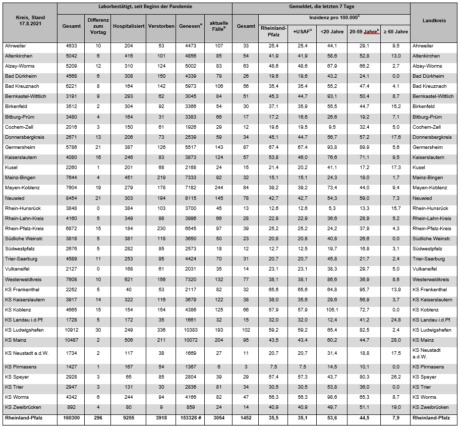 Coronavirus SARS-CoV-2: Aktuelle Fallzahlen für Rheinland-Pfalz, (Datenstand vom 17.08.2021, 14:10 Uhr)