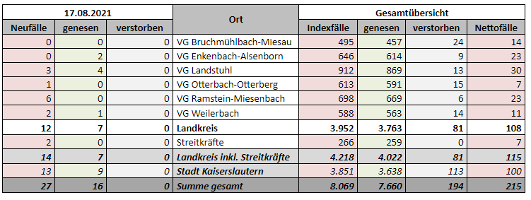 8.069 Indexfälle in Stadt und Landkreis, 7.660 genesenen Personen, 194 Todesfälle, 17.08.