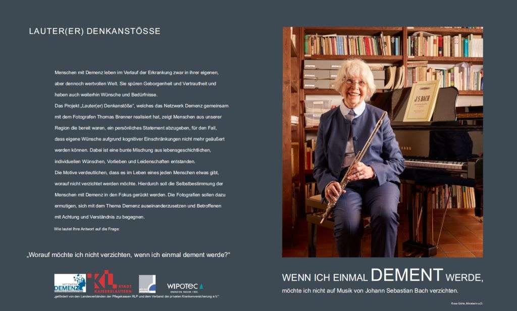 Die zusammen mit dem Fotografen Thomas Brenner konzipierte Ausstellung zeigt auf 55 Fotografien Personen aus Stadt und Landkreis Kaiserslautern. Sie alle geben ein persönliches Statement für den Fall ab, dass sie eigene Wünsche aufgrund kognitiver Einschränkungen wie etwa einer demenziellen Erkrankung nicht mehr äußern können.