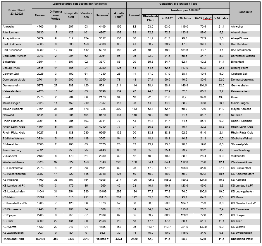 Coronavirus SARS-CoV-2: Aktuelle Fallzahlen für Rheinland-Pfalz, (Datenstand vom 23.08.2021, 14:10 Uhr)