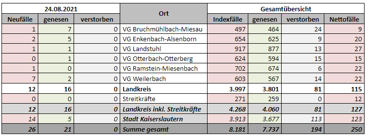 8.181 Indexfälle in Stadt und Landkreis, 7.737 genesenen Personen, 194 Todesfälle, 24.08.