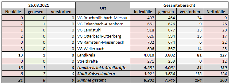 Corona-Zahlen für die Stadt und den Landkreis Kaiserslautern können Sie dieser Statistik entnehmen:
