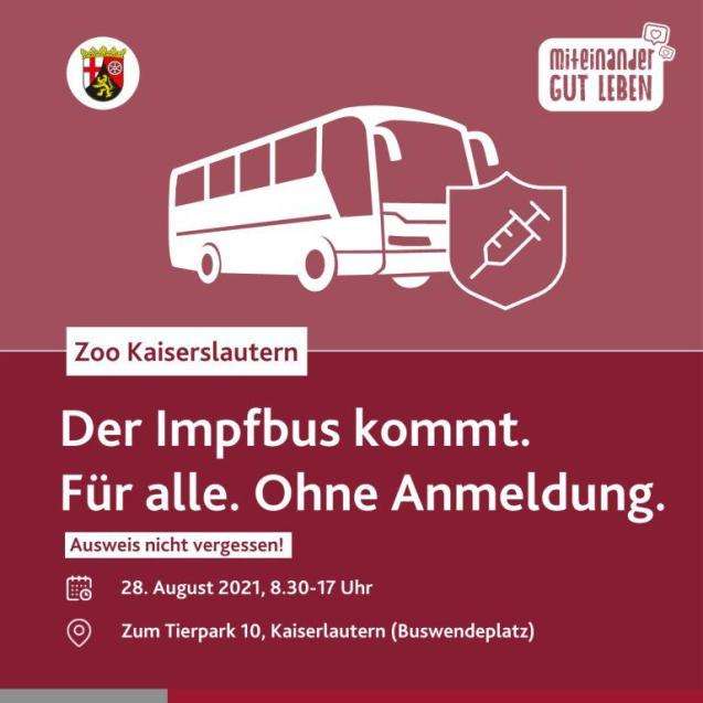 Wer noch ohne Impfung ist, kann sich im Impfbus am 28. August in der Zeit von 8:30 Uhr bis 17 Uhr vor dem Siegelbacher Zoo ohne vorherige Anmeldung impfen lassen. Lediglich der Ausweis wird benötigt.