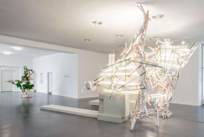 Michael Dekker erhielt 2014 den Nachwuchspreis Plastik: Blick in die Preisträger-Ausstellung im mpk 2015 mit seiner monumentalen Arbeit „Broken Platforms“ von 2015, (Foto und © Studio Michael Dekker)