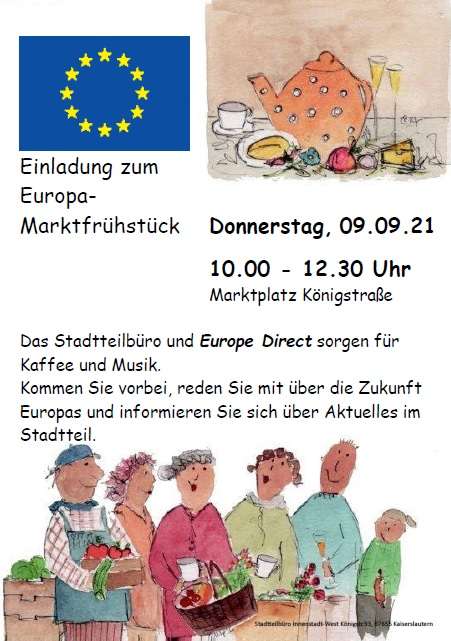 Von 7. bis 9. September 2021, jeweils von 11 bis 16 Uhr, wird das Stadtteilbüro Innenstadt-West in der Königstraße 93 zu einer zentralen Anlaufstelle für Informationen, Fragen und Anregungen rund um das Thema Europa. Eine Kooperation des Europe Direct Kaiserslautern mit dem Arbeits- und sozialpädagogischen Zentrum ASZ bietet den Bürgerinnen und Bürgern des Stadtteils die günstige Gelegenheit, über Herausforderungen und Prioritäten für Europa zu diskutieren und ihre Wünsche und Ideen zur Zukunft Europas einzubringen. Es gibt eine Vielfalt kostenloser Infomaterialien, darunter Europakarten und -broschüren für Kinder. Am Donnerstag, 9. September, von 10.00 Uhr bis 12.30 Uhr findet auf dem Marktplatz in der Königstraße als Highlight ein Europa-Marktfrühstück mit Kaffee und Musik statt.