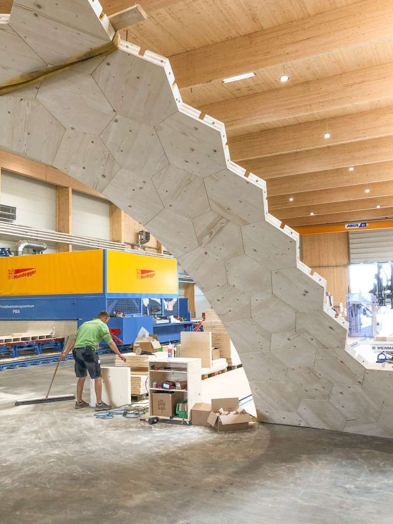 Der Pavillon hat eine Spannweite von zwölf Metern und seine Holzkuppel eine Fläche von 100 Quadratmetern. Er besteht komplett aus Recycling-Abschnitten, die bei der Produktion von Brettsperrholz angefallen sind. Entworfen und gebaut wurde der Pavillon mit digitaler Technik. Das Team um Professor Christopher Robeller hat dazu gemeinsam mit dem rheinland-pfälzischen Holzbauunternehmen CLTech zusammengearbeitet und Recycling-Abschnitte aus der Produktion von Brettsperrholz verwendet.