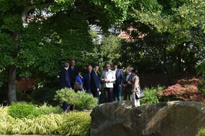 BU: Am Nachmittag besuchte der Generalkonsul gemeinsam mit Peter Kiefer den Japanischen Garten, wo er vom 1. Vorsitzenden Ralf Kammer durch die Anlage geführt wurde. Rechts im Bild Vizekonsulin Mariko Yano.
