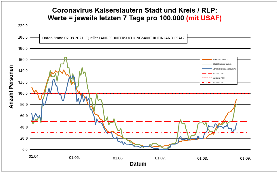 D USAF = U.S. Armed Forces; Berechnung der Inzidenz /100.000 unter Berücksichtigung der mit Stand vom 30.6.2020 in der Gebietseinheit stationierten U.S. Streitkräfte