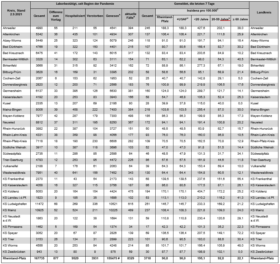 Coronavirus SARS-CoV-2: Aktuelle Fallzahlen für Rheinland-Pfalz, (Datenstand vom 02.09.2021, 14:10 Uhr)