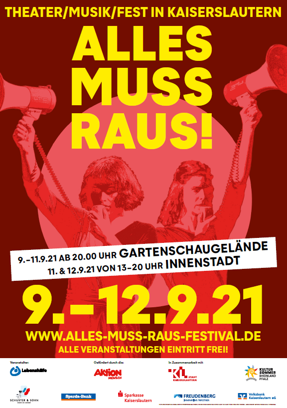 ALLES MUSS RAUS! – Deutschlands einzigartiges Straßentheater- und Musikfestival meldet sich zurück! Überraschend und kurzfristig, ungewohnt im September, erstmals schon am Donnerstag, mit Parkbespielungen abends auf dem Gelände der Gartenschau, mit Theater und Musik tagsüber am Samstag und Sonntag auf ausgewählten Plätzen der Innenstadt, mit einem Covid-19-Hygienekonzept, und auch noch mit einem Online-Reservierungssystem für die kostenlosen (!) Eintrittskarten. Alles neu, alles anders macht die Pandemie. Gleichwohl sind die Veranstalter überglücklich, wieder mit diesem besonderen Festival am Start zu sein, und freuen sich auf tolle Ensembles, auf besondere Künstler*innen mit und ohne Beeinträchtigung – und auf das lange vermisste Publikum! Informationen zum Programm gibt es auf der Festival-Website www.alles-muss-raus-festival.de, dort kann man auch gleich die kostenlosen Tickets für die einzelnen Veranstaltungen über die dort angebotenen Zeitfenster-buttons buchen, oder direkt unter https://ctz.kaiserslautern.de. Höchste Zeit für ein neuerliches inklusives Fest der Begegnung in Kaiserslautern – wenngleich in diesem Jahr mit Abstand.