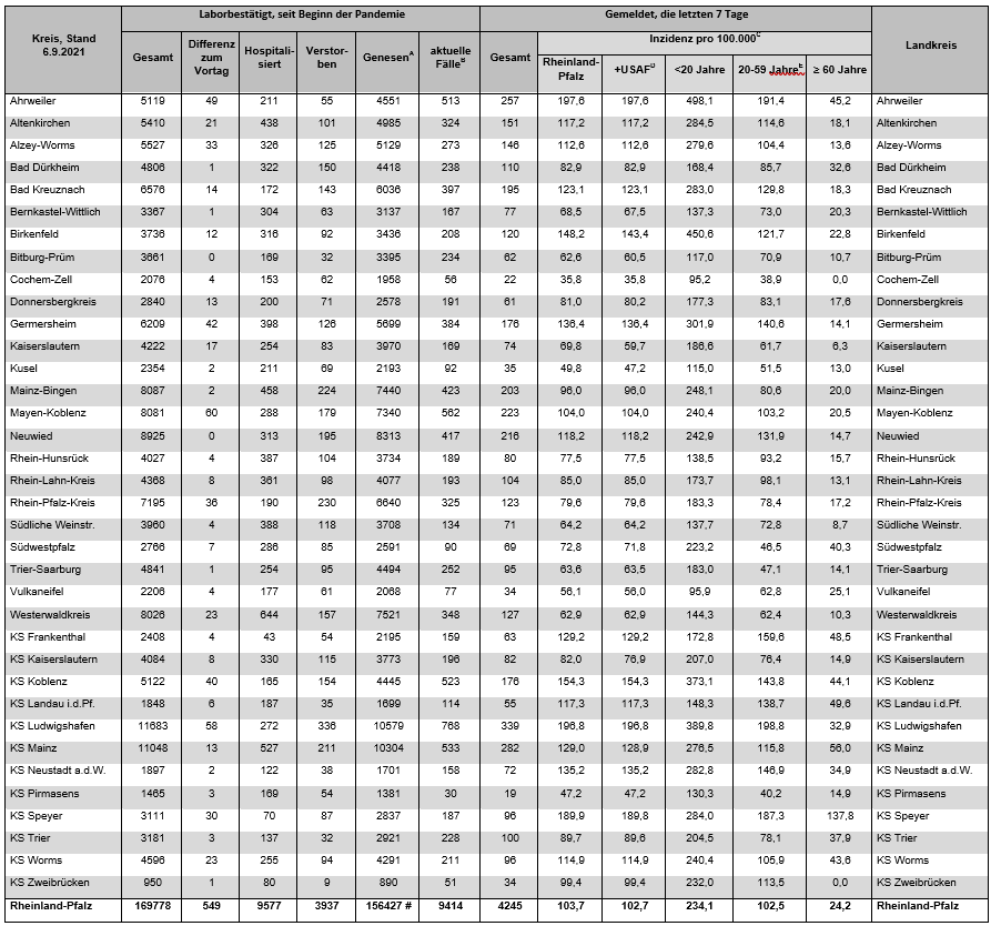 Coronavirus SARS-CoV-2: Aktuelle Fallzahlen für Rheinland-Pfalz, (Datenstand vom 06.09.2021, 14:10 Uhr)
