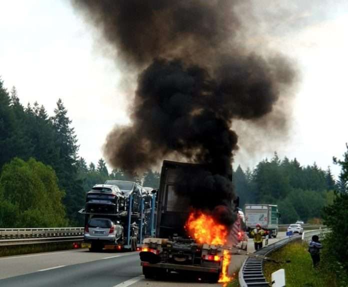 Am frühen Freitag morgen kam es zu einer Verkehrsbehinderung auf der A63 in Richtung Mainz, zwischen Kaiserslautern und Sembach. Ein Reifen einer Zugmaschine eines Spezial-LKW fing, vermutlich aufgrund eines technischen Defektes Feuer. Das Feuer griff auf den LKW über. Die Autobahn war für ca. eine halbe Stunde voll gesperrt. Nachdem der LKW durch die Feuerwehr gelöscht wurde, war bis zur endgültigen Bergung des LKWs, der rechte Fahrstreifen weiterhin nicht befahrbar. Der Gesamtschaden beläuft sich auf ca. 13.000 Euro.
