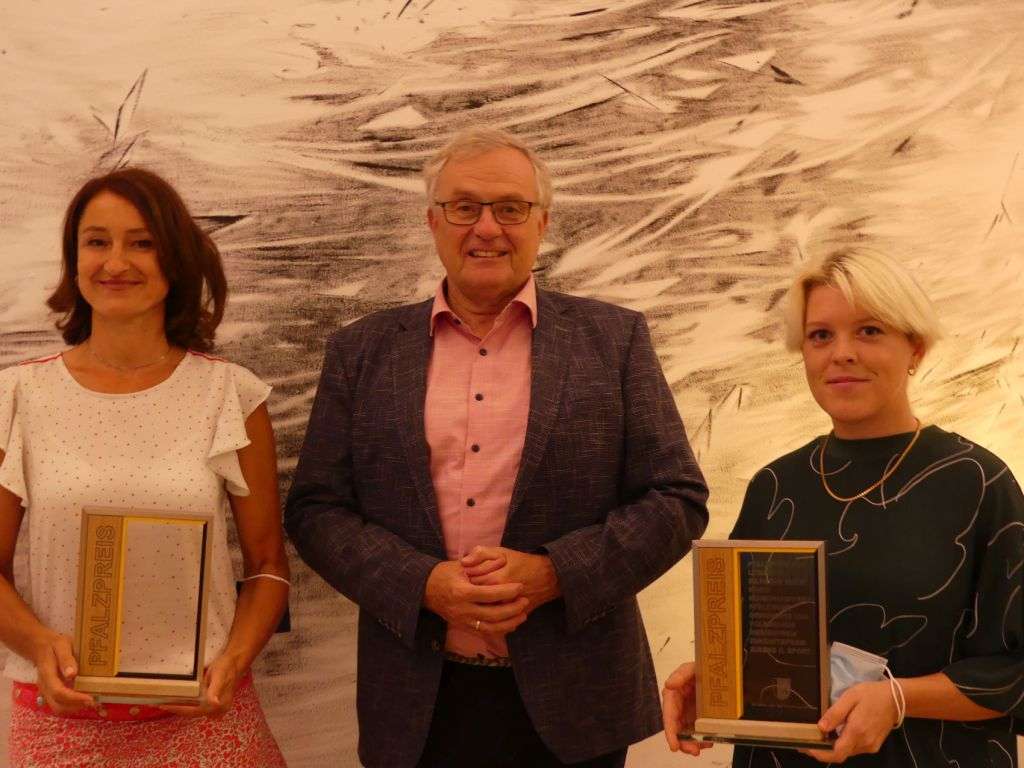 Über die Würdigung bewegt und erfreut zugleich: Fritzi Haußmann (links) und Theresa Lawrenz mit dem Bezirkstagsvorsitzenden Theo Wieder