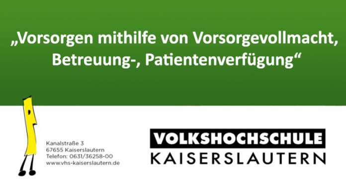 Am Donnerstag, dem 28.10.2021, findet in der Volkshochschule Kaiserslautern um 15 Uhr, ein Vortrag zum Thema; „Vorsorgen mithilfe von Vorsorgevollmacht, Betreuung-, Patientenverfügung“ statt. Tritt der Fall ein, dass Sie durch einen plötzlichen Unfall, eine Krankheit oder auf anderem Wege Ihr Bewusstsein verlieren, so muss eine andere Person anstehende Entscheidungen für Sie treffen. Entgegen der landläufigen Meinung dürfen der Ehegatte, die Kinder oder andere nahestehende Angehörige nicht automatisch Entscheidungen für Sie vornehmen. Sorgen Sie jetzt vor, und bestimmen Sie, wer in solchen Fällen wie für Sie entscheidet. In dieser Veranstaltung werden Ihnen verschiedene Möglichkeiten der Vorsorge und die Abgrenzung zur gesetzlichen Betreuung dargestellt. Geleitet wird der Vortrag von Christian Simunic.