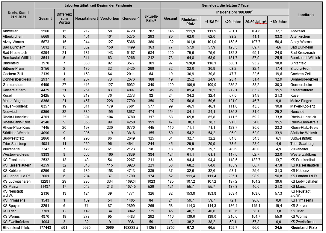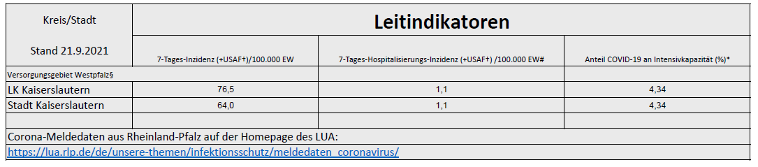 Coronavirus SARS-CoV-2: Fallzahlen und Leitindikatoren für Rheinland-Pfalz, (Datenstand vom 21.09.2021, 14:10 Uhr)
