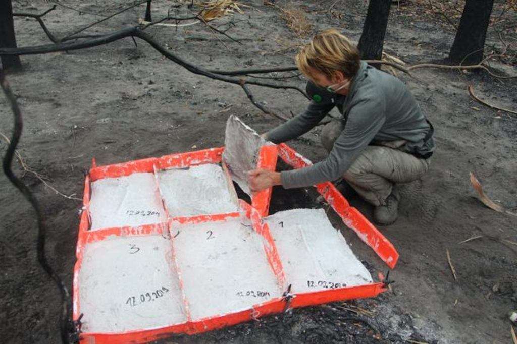 Bu: Künstlerisch forschende Spurensicherung: Betty Beier bei einer Bodenabnahme im verbrannten Wald Tres Gigantes, Pantanal Paraguay, 2019