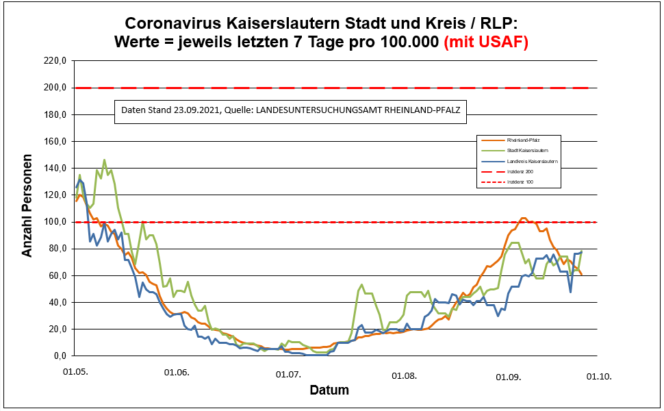 Coronavirus KL letzten 7 Tage pro 100.000 (mit USAF): Landkreis 77,3 ; Stadt 78,1 ; RLP 61,0