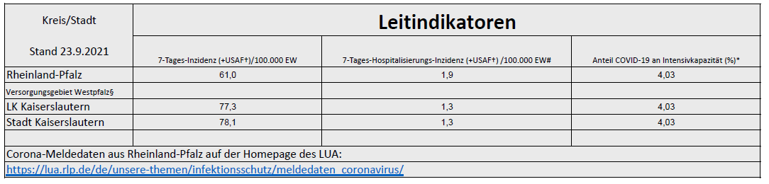Coronavirus SARS-CoV-2: Fallzahlen und Leitindikatoren für Rheinland-Pfalz, (Datenstand vom 23.09.2021, 14:10 Uhr)
