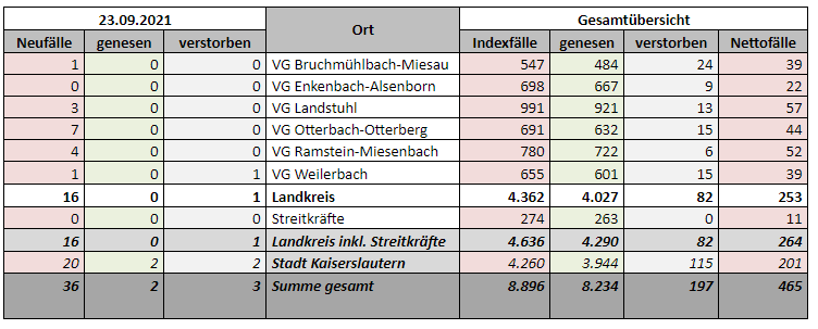 8.896 Indexfälle in Stadt und Landkreis, 8.234 genesenen Personen, 197 Todesfälle, 23.09.