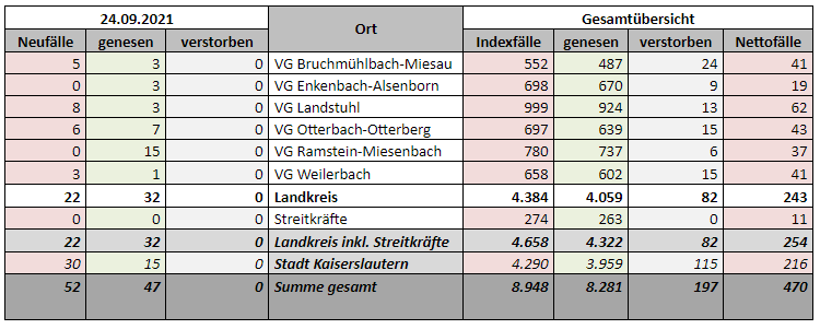 8.948 Indexfälle in Stadt und Landkreis, 8.281 genesenen Personen, 197 Todesfälle, 24.09.