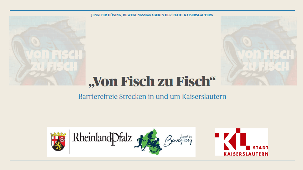 Es ist nicht immer leicht eine geeignete Strecke zu finden, wenn man mit dem Kinderwagen oder Rollstuhl unterwegs ist in Kaiserslautern. Diese Rückmeldung hat die Bewegungsmanagerin der Stadt Kaiserslautern von Seniorinnen und Senioren, aber auch von jungen Müttern erhalten und darauf reagiert. „Wichtig ist bei einer Streckenbeschreibung der Start und das Ziel und so war relativ schnell klar, dass die noch vereinzelt in der Stadt stehenden Fische genau diesen Zweck erfüllen können“, erläutert Jennifer Höning. Durch den Aufruf in der Rheinpfalz am 24.08. haben sich zahlreiche Bürgerinnen und Bürger bei ihr gemeldet und ihr dabei geholfen alle mittlerweile „versteckten Fische“ auch zu finden. Die aufgeführten Strecken hat sie selbst mit dem Kinderwagen getestet und ist begeistert von den abwechslungsreichen Touren in den Stadtteilen aber auch in der Innenstadt. Physiotherapeuten, die Gemeindeschwester Plus aber auch Gruppen von Senioren und Kindern nutzen diese Strecken schon, um gemeinsam mit Menschen mit Beeinträchtigungen neue Wege auszuprobieren.