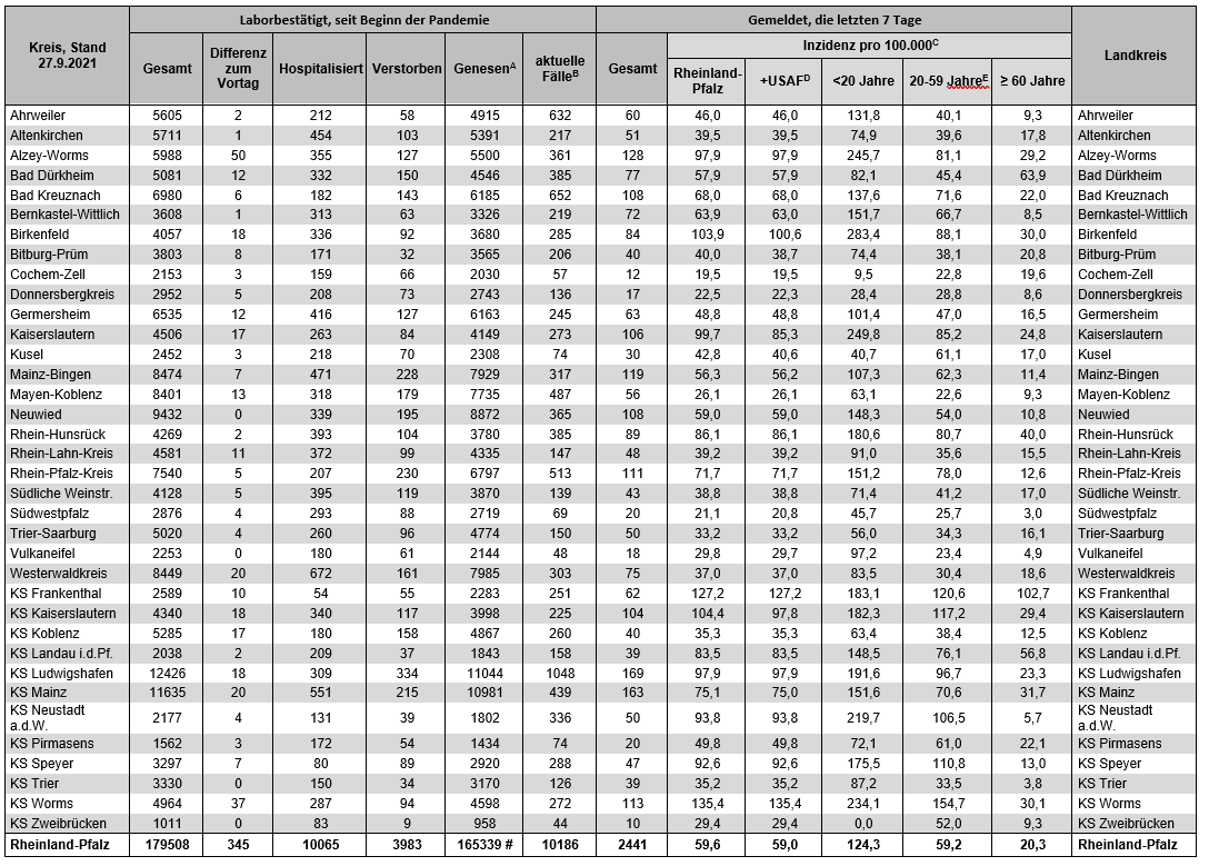 Coronavirus SARS-CoV-2: Fallzahlen und Leitindikatoren für Rheinland-Pfalz, (Datenstand vom 27.09.2021, 14:10 Uhr)