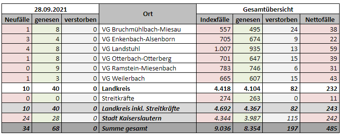 9.036 Indexfälle in Stadt und Landkreis, 8.354 genesenen Personen, 197 Todesfälle, 28.09.