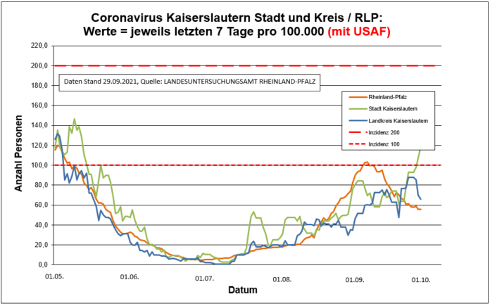 Coronavirus KL letzten 7 Tage pro 100.000 (mit USAF): Landkreis 66,0 ; Stadt 118,5 ; RLP 55,6