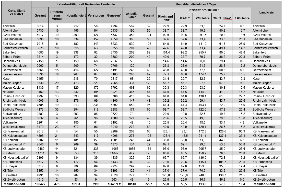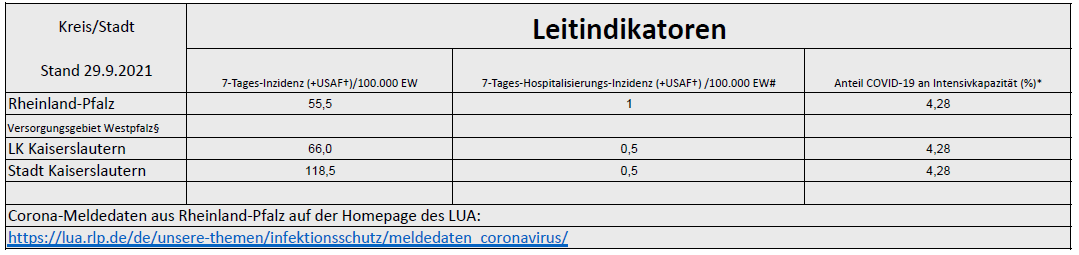 Coronavirus SARS-CoV-2: Fallzahlen und Leitindikatoren für Rheinland-Pfalz, (Datenstand vom 29.09.2021, 14:10 Uhr)