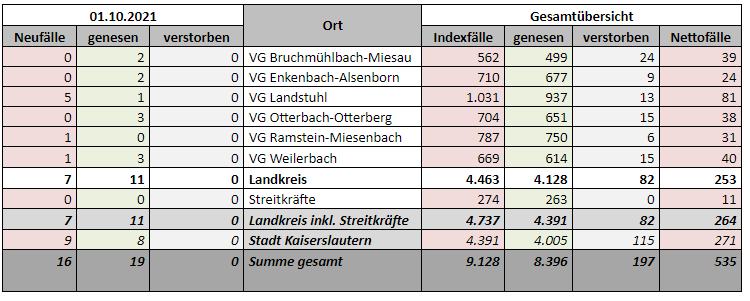 9.128 Indexfälle in Stadt und Landkreis, 8.396 genesenen Personen, 197 Todesfälle, 01.10.