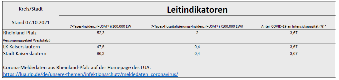 Coronavirus SARS-CoV-2: Fallzahlen und Leitindikatoren für Rheinland-Pfalz, (Datenstand vom 07.10.2021, 14:10 Uhr)