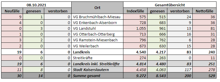 9.272 Indexfälle in Stadt und Landkreis, 8.543 genesenen Personen, 200 Todesfälle, 08.10.