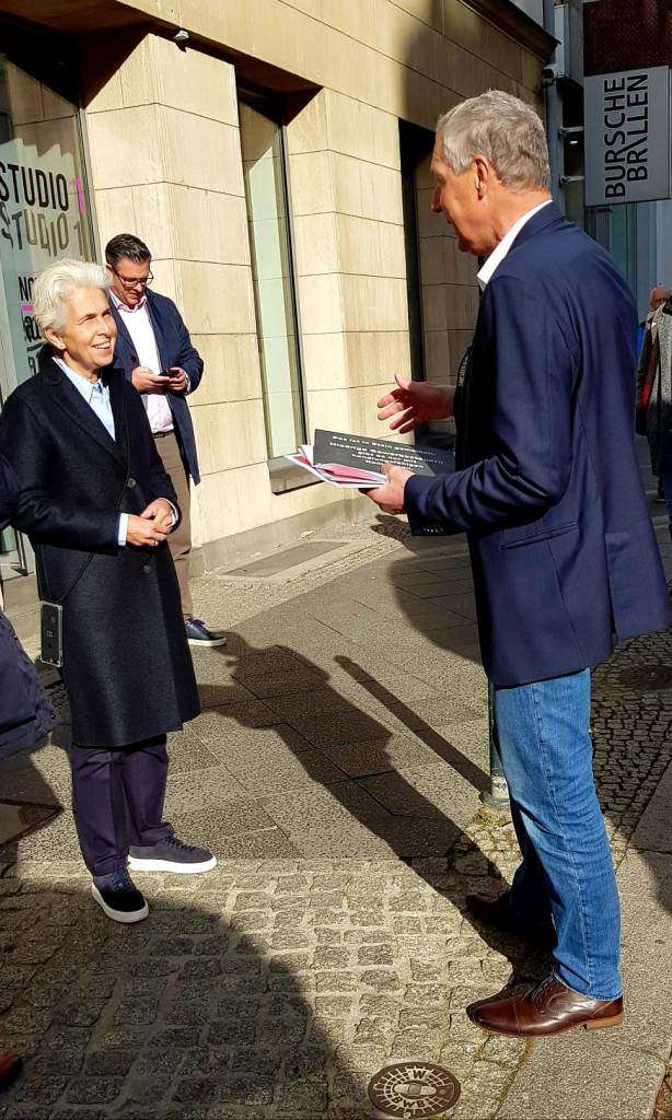 Peter Kiefer überreichte einen der fünf Steine, den für die FDP. Das Bild zeigt das Treffen mit der Kommunalpolitischen Sprecherin der FDP, Marie-Agnes Strack-Zimmermann.