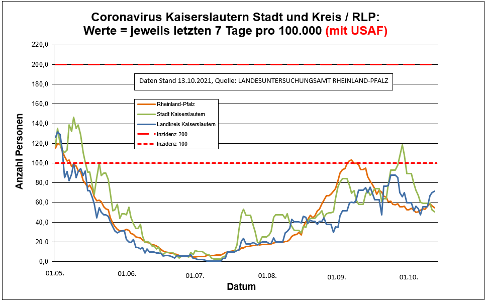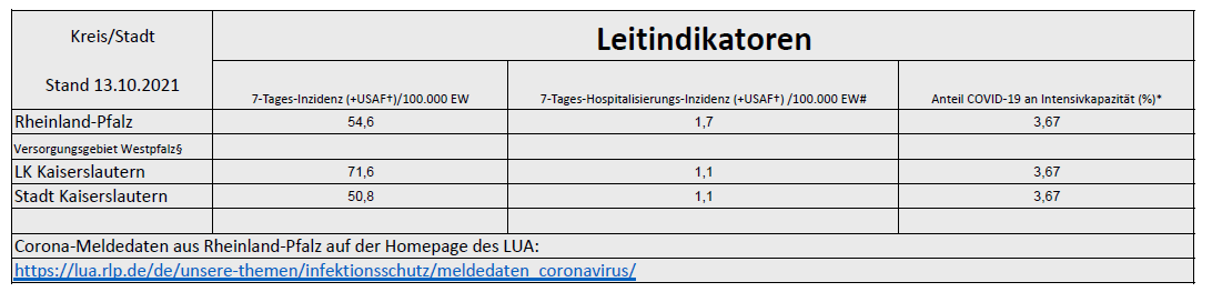 Coronavirus SARS-CoV-2: Fallzahlen und Leitindikatoren für Rheinland-Pfalz, (Datenstand vom 13.10.2021, 14:10 Uhr)