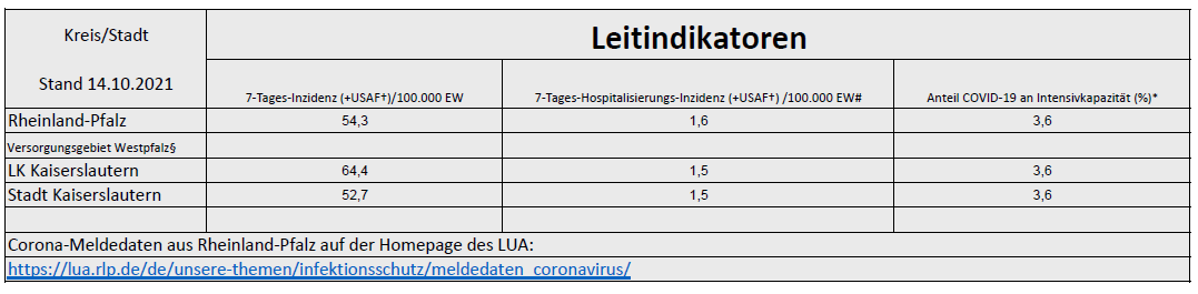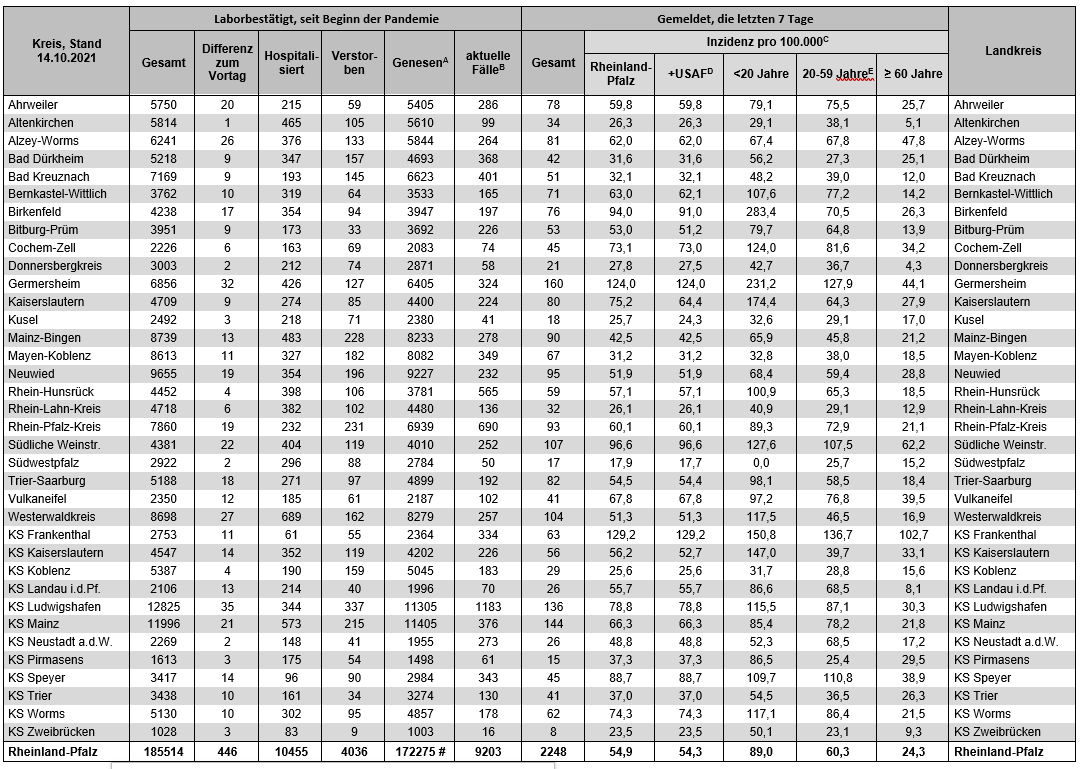Coronavirus SARS-CoV-2: Fallzahlen und Leitindikatoren für Rheinland-Pfalz, (Datenstand vom 14.10.2021, 14:10 Uhr)