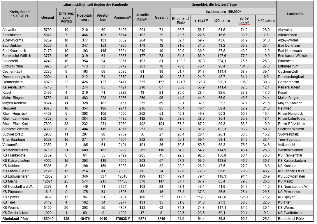 Die Fallzahlen zum Coronavirus in Rheinland-Pfalz und die Leitindikatoren für die Warnstufen: Seit gestern gibt es 435 bestätigte Corona-Fälle, 4 weitere Personen sind im Zusammenhang mit einer Infektion gestorben. Die landesweite 7-Tages-Inzidenz (+USAF) steigt auf 54,4 pro 100.000 Einwohner (Vortag: 54,3). Die landesweite 7-Tages-Hospitalisierungsinzidenz steigt auf 1,8 pro 100.000 Einwohner (Vortag: 1,6).